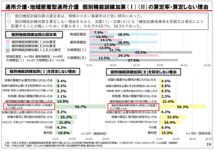 同加算の算定率は、規模の小さい事業所ほど低い傾向にある。例えば、地域密着型では「(I)のみ算定」が7.9%、大規模型(II)で同29.2%などとなっている=資料1=。算定しない理由では「機能訓練指導員を常勤又は専従により配置することが難しいため」が(I)で59.7%、(II)で56.3%と、それぞれ最も多かった。