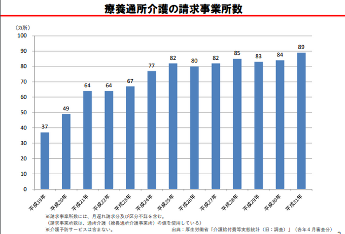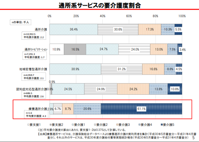 療養通所介護は、難病などの重度要介護者やがん末期の利用者を対象とした地域密着型サービス。看護師の常勤配置の下、サービスを提供している。12年以降の事業所数は横ばいから微増傾向にあり、19年時点で89。18年5月-19年4月の実績では、要介護5の利用者が61.1%を占めている。