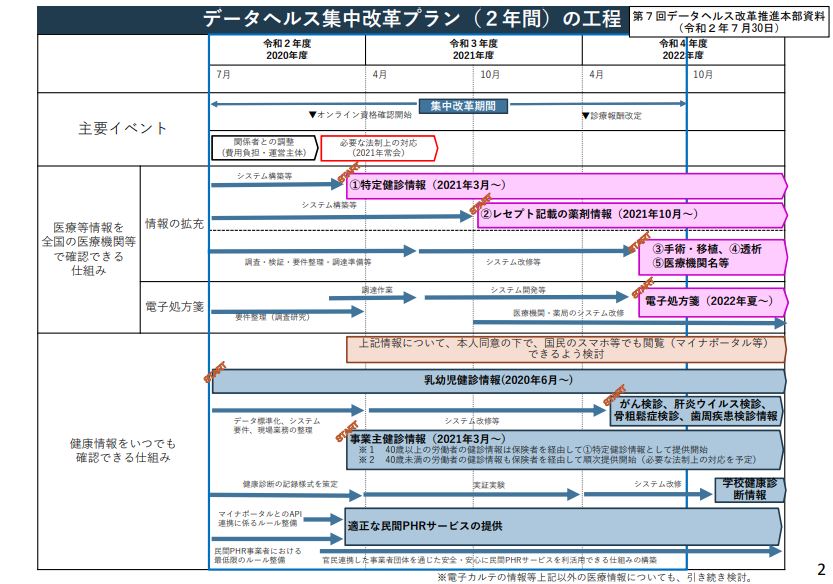 厚生労働省は21日、「健康・医療・介護情報利活用検討会」「医療等情報利活用ワーキンググループ」「健診等情報利活用ワーキンググループ」を合同開催した。7月のデータヘルス改革に関する閣議決定を受けて、「新たな日常にも対応したデータヘルスの集中改革プラン」の3つの「ACTION」に沿って取り組みを進めるため、年末までに論点ごとの対応について議論し、可能なものから一定の整理を行うスケジュールを厚労省が示した。【齋藤栄子】
