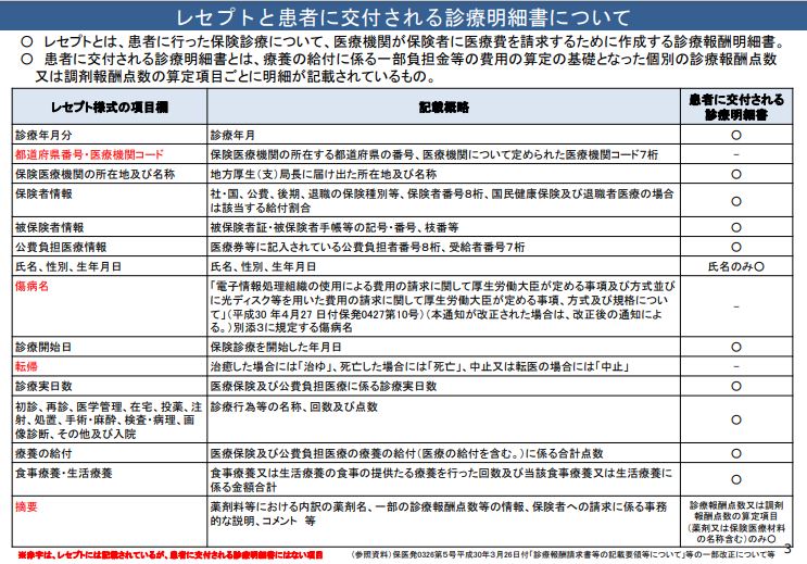 ACTION1では、患者が確認できる保健医療情報について、▽原則、患者に交付される診療明細書の全てとする▽診療明細書に存在しないが、レセプトに記載されている傷病名(現病名)の情報を患者本人が確認できるようにする-などが課題に挙がった。レセプトは、患者に行った保険診療について医療機関が保険者に医療費を請求するために作成する診療報酬明細書。一方、患者に交付される診療明細書とは、一部負担金等の診療報酬点数などの明細であるため、記載内容が異なる=資料2=。