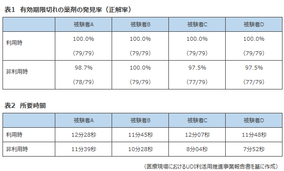 すると、バーコードシステムを利用した場合には有効期限切れの薬剤を4人とも全て発見できました。これに対し、利用しない場合に全てを発見できたのは1人のみ。残り3人の「発見率(正解率)」は、1人が98.7%、2人は97.5%でした(表1)。