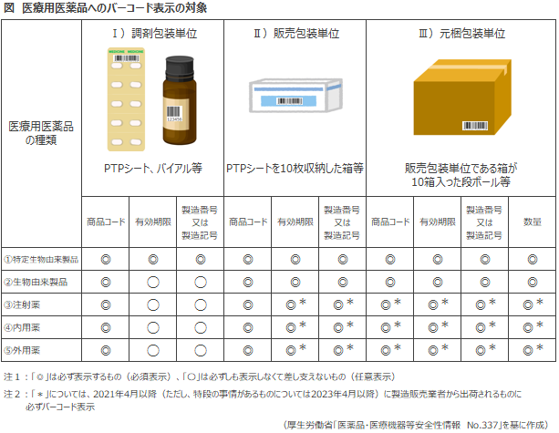 そうしたルールは19年12月に公布された改正医薬品医療機器等法に引き継がれ、22年12月以降は同法による規制に「格上げ」されます。それと並行して国は、薬局など医療現場によるバーコードの活用を推進する方針です。例えば、回収が必要になった医薬品が店内の在庫にないかを薬局や医療機関が確認したり、医薬品を調製・調剤する際の取り違えを防いだりすることを想定しています。