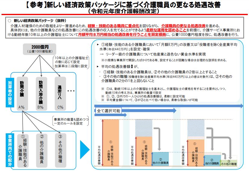 調査は、介護従事者の処遇の状況等を把握して、次期介護報酬改定の基礎資料とするもの。有効回答数は7,346施設・事業所(有効回答率64.9%)。特定処遇改善加算は、経験・技能のある職員に重点化を図りながら、介護職員のさらなる処遇改善を進めることを目的に、介護サービス事業所の勤続年数10年以上の介護福祉士について月額8万円相当の処遇改善を行うことを目指したもの=資料=。