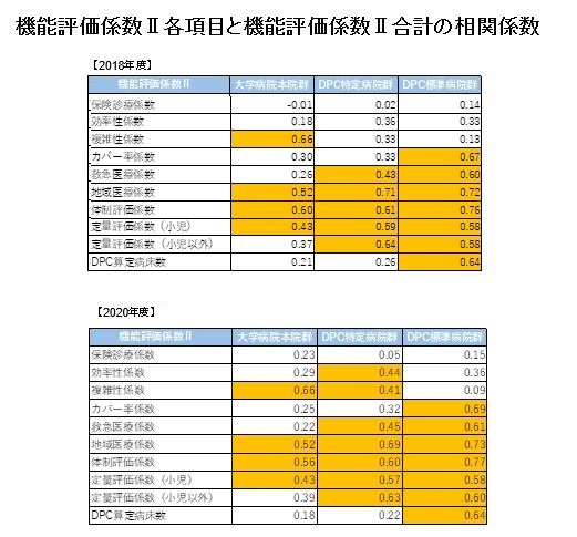 表1は、機能評価係数IIの各項目と機能評価係数II合計の相関係数を医療機関群別に示したものであり、相関係数が0.4以上の項目に色を付けている。機能評価係数IIの6項目については均等配分で、全国のDPC対象病院に用意される予算は変わらないわけだが、項目によって差がつきやすいものとそうではないものがあるということだ。