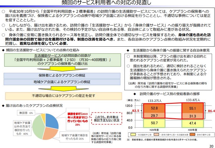 2018年度介護報酬改定において、訪問介護の生活援助中心型サービスで通常よりもかけ離れた回数(※)をケアプランに位置付ける場合には、ケアマネジャーが市町村へ届け出ることを義務化し、市町村が地域ケア会議で検証の上、必要に応じて再検討を促すことが決まり、18年10月から届出が開始された=資料=。