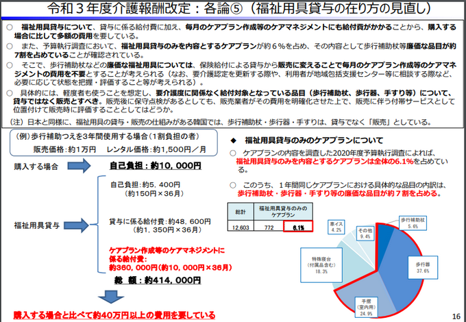 財政制度分科会で財務省が示した資料では、福祉用具貸与のみを行うケアプランについて、福祉用具を「購入する場合に比して多額の費用を要している」と指摘。歩行補助杖、歩行器、手すりなどの「要介護度に関係なく給付対象となっている品目」について、2021年度介護報酬改定に合わせ、「貸与ではなく販売とすべき」と提言している。