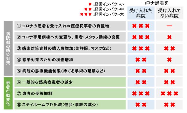 この2つの観点で、病院団体の調査報告や、クライアントの指標などから経営インパクトを整理した=図1=。新型コロナウイルス感染症の患者を受け入れた病院と受け入れていない病院で、それぞれインパクトは異なるものの、いずれの病院も甚大な影響を受けている。
