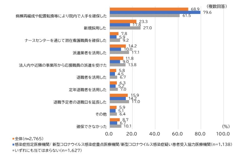 病院で看護職員が不足した場合、「病棟再編成や配置転換等により院内で人手を確保した」が68.9%で最も多かった=資料1=。感染症指定医療機関等でも同様に人手を確保した割合が79.6%で最多だった。