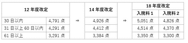 さらに18年度改定では、「直近1年の入院日数の平均が30日未満」などの要件を満たすか否かで、入院料1と2に分かれた=表2=。