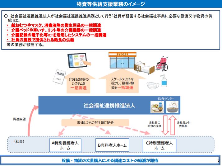 また、社員が経営する社会福祉事業に必要な設備または物資の供給について、紙おむつやマスクなどの一括調達や、社員の施設で提供される給食の供給も可能と例示した=資料1=。