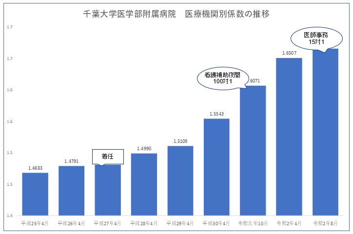 グラフ1は千葉大学病院の医療機関別係数の推移である。15年4月に私が着任する前は、大きな変化はなかった。着任後から一気にペースアップして、2年後には1.5を超えることができた。医療機関別係数の0.03は、同院にとって同じ患者数であっても年間1.5億円を超える「真水の増収」となる。これは幸運だったことも否定できないのだが、それなりに取り組みを行ったのも事実である。