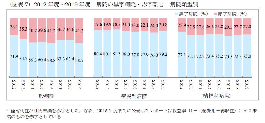 同機構は毎年、貸付先から提出された財務諸表データを用いて病院の経営状況を分析・報告している。19年度は、一般病院702、療養型病院375、精神科病院230の施設を集計した。赤字割合は、一般病院では41.3%で、前年度から4.7ポイント増=資料=。療養型病院は3.2ポイント減の20.8%、精神科病院は0.7ポイント減の27.0%だった。