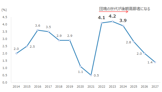 医療や介護の費用が掛かる75歳以上の人口の伸びは、20年から21年にかけていったん鈍化しましたが、22年から24年には未曽有のペースで急増する見通しです=図=。人口のボリュームが大きい「団塊の世代」の人たちがこの期間に75歳以上になるためです。