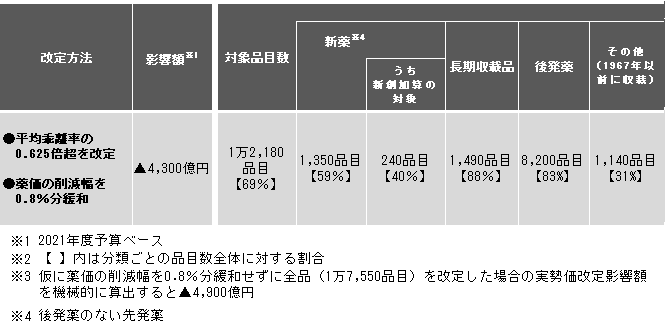 また、医薬品を供給する最低限のコストを確保するため、剤形ごとの「最低薬価」までに下げ幅をとどめるなど、市場価格に基づく引き下げの影響を調整する4つのルールを適用することになりました。財務省は、一連の見直しで21年度に国費1,001億円(医療費ベースだと4,315億円)を節約できるとしています。