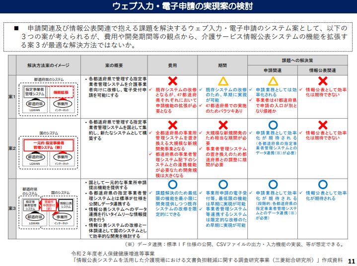 ICT化では、申請・情報公表関連のウェブ入力・電子申請のシステム案を3案に絞って検討し、費用や開発期間等の観点から、介護サービス情報公表システムの機能を拡張する案が最適とする検討状況について報告された。