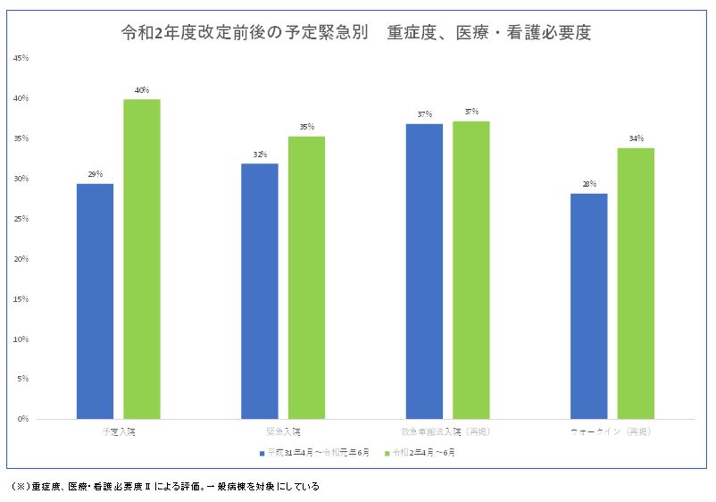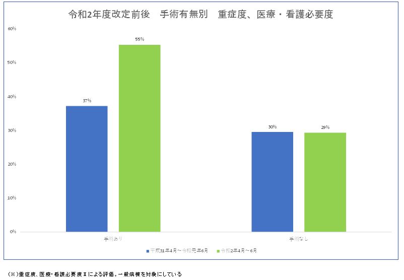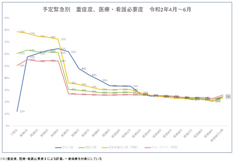 病院全体としての結果は、19年4-6月は退院患者が6万7,275件で、看護必要度は33.0%、20年4-6月はそれぞれ5万3,946件、38.1%と、コロナ禍も看護必要度は5ポイント程度、上昇していた。コロナにより退院患者数は19.8%減少したものの、改定の影響もあり看護必要度は決して下がっていないことは注目される。