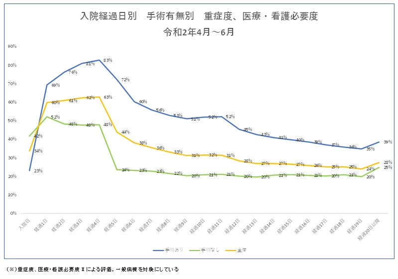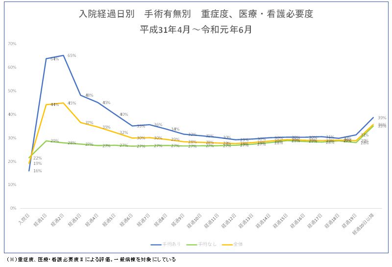 さらに、入院経過日別・手術有無別に看護必要度を見ると、改定前は手術患者について特に入院初期に必要度を満たす割合が多くなっているが、在院日数が長くなるにつれて手術なし患者との差が縮小し、ほぼ同じレベルに達する。また、手術なし患者は在院日数が長くなっても看護必要度が下落する傾向にはなかった=グラフ2=。それに対して、改定後は手術患者の評価が一貫して高く、手術なし患者については経過日4日を超えると急激に必要度が下落することが分かる=グラフ3=。これは、救急医療管理加算等がA項目において5日目まで評価されていることに関係しているが、手術なし患者で急性期一般入院料1の基準値を満たすことは容易ではないことも、同時に意味する。
