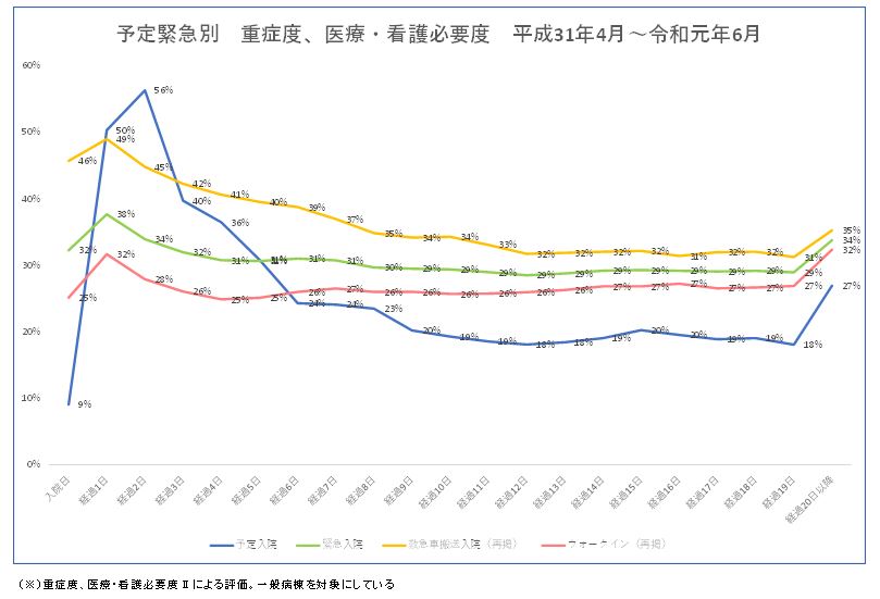 これらをさらに深掘りするために、予定緊急別に看護必要度を見ると、改定前は緊急入院の方が予定入院より高かったが、改定後はこれが逆転している=グラフ4=。また、改定前の入院経過日別で見ると緊急入院、特に救急車搬送入院の評価が明らかに高いのに対して、予定入院は経過日5日を超えると30%を下回る状況であった=グラフ5=。
