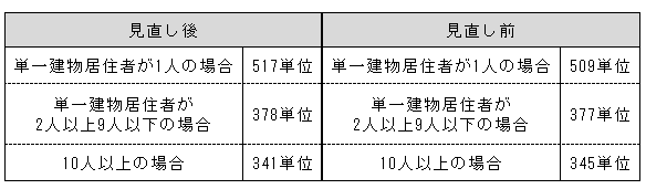 居宅療養管理指導では従来、同じ建物に住む複数の利用者(同一建物居住者)を1日に訪問するケースで評価が低く設定されていましたが、18年度の介護報酬改定で国は、同じ建物の利用者をその月に何人訪問したか(単一建物居住者)を評価軸に切り替え、「10人以上」への評価を低く設定した経緯があります。