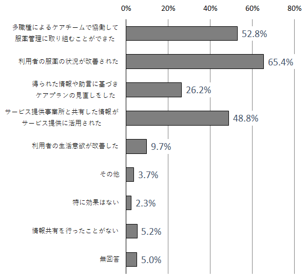 3年前の18年度には、主治医、歯科医師、薬剤師へ必要に応じて情報提供することがケアマネジャーに義務付けられました。厚労省の研究班の調べでは、服薬の情報を関係機関と共有したことで、服薬状況の改善など一定の成果を実感するケアマネジャーが多いことが分かっています(図)。