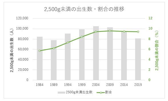 出生数が減少する一方で、2,500グラム未満の新生児の出生数と割合は、90年代から2000年代にかけて増加した=グラフ2=。全体の出生数が減少したため、2,500グラム未満の出生数こそ減少し始めているが、割合は2000年代以降10%弱でほぼ横ばいとなっている。そのため、全体の出生数は減少していても、ハイリスクの妊婦の管理や分娩の対応などへの負担は、相対的に重くなっているものと思われる。