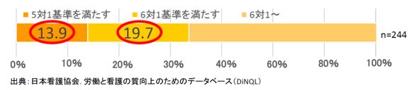 要望書において、看護必要度の高い病棟では看護配置がより手厚いことが示された=グラフ1=。