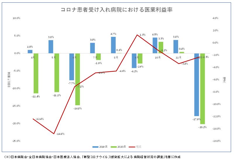 政府は、緊急事態宣言やまん延防止等重点措置の対象となる都道府県のうち、2020年12月25日から21年6月13日までに新型コロナウイルス患者への病床が割り当てられた病院に対して、病床確保数による補助を行うことでさらなる病床確保を狙っている。この補助は、前年度に補助を受けていない病床が対象となるため、新規の病床確保を促進するためのものである。もちろん、継続的に補助を行ってもらえることに対して病院は感謝すべきであるが、そもそもコロナ前から赤字であった病院業績、具体的には医業損益はより一層深刻になりつつある。