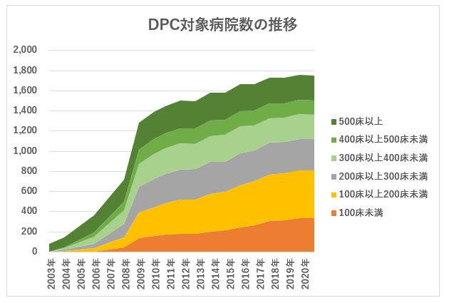 現在、DPC対象病院は1,755病院まで増加した=グラフ1=。また年々、100床未満、100床以上200床未満の、中小病院の制度参加が増えている=グラフ2=。結果的に、病床規模も、医療提供体制も異なる、さまざまな病院によりDPC制度が運用されている現状において、診療内容のばらつきが生じていることは事実だろう。