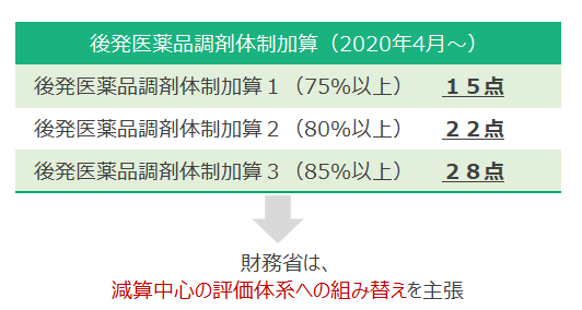 気になるのは、後発医薬品の使用促進策として挙がった「後発医薬品調剤体制加算」の見直しです。