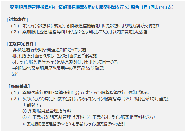 改正薬機法に基づくオンライン服薬指導が施行されるのに先立ち、20年度の診療報酬改定で新設されたのは、医師のオンライン診療を受けた外来患者さん向けの「薬剤服用歴管理指導料4(オンライン服薬指導を行った場合)」(月1回まで43点)と、訪問診療を受けている患者さん向けの「在宅患者訪問薬剤管理指導料・在宅患者オンライン服薬指導料」(月1回まで57点)です。