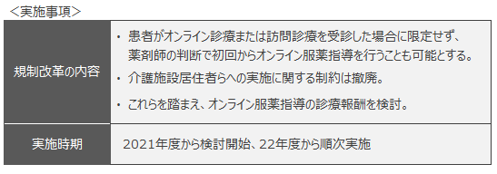 主要政策のスケジュールを分野ごとにまとめた成長戦略フォローアップの工程表では、オンライン服薬指導について、新たなルールの検討や20年度に新設された報酬の検証・調査の結果などを踏まえ、「診療報酬上の要件の見直し」を21年度中に検討するとしています。さらに、この工程表によると、エビデンスに基づく評価の検討を22年度以降も継続させる方針です。