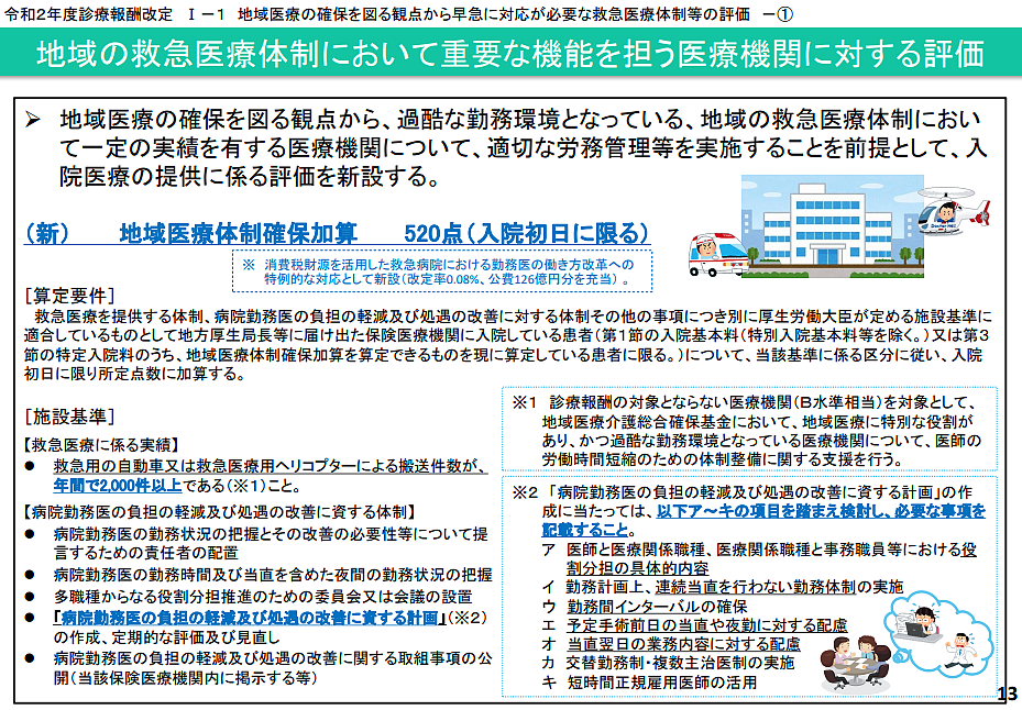 国はこれまで、医師の「働き方改革」に係る医療機関での取り組みを診療報酬で後押ししてきた。その1つが、20年度改定での地域医療体制確保加算の新設だ。これは、適切な労働管理の実施を前提として地域の救急医療体制で一定の実績がある医療機関を評価する加算で、その施設基準は救急搬送が年2,000件以上あることや、勤務医の負担の軽減や処遇改善につながる計画の作成など。