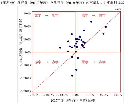 介護医療院への移行前後の平均事業利益率は、移行前となる17年度の2.1%から、19年度は10.6%へと上がった。移行後に事業利益率が上昇した施設(図の赤い点線の左上に位置)は、全体の78.1%(25施設)を占めた。他の介護保険施設と比べても比較的高いが、留意点として、18年度はダブル改定があったこと、施設の一部移行であるため、移行していない既存施設の収益にも考慮が必要だとしている。