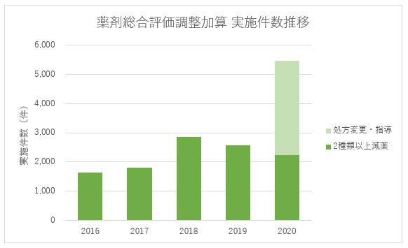 2種類以上減薬:16-19年は薬剤総合評価調整加算の件数、20年は薬剤調整加算の件数