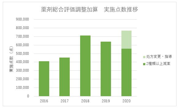 2種類以上減薬:16-19年は薬剤総合評価調整加算の点数、20年は薬剤調整加算の件数に250点を乗じた点数