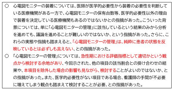 資料1 診療情報・指標等作業グループにおける検討内容の看護必要度の心電図モニターの指摘内容の一部(赤字は筆者の色付け)