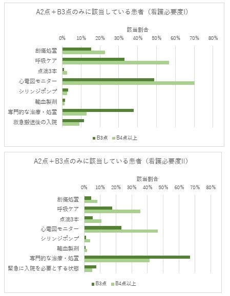 資料2 A2点+B3点の条件のみに該当している患者のA2点、B3点・B4点以上の内訳 上段:看護必要度I 下段:看護必要度II