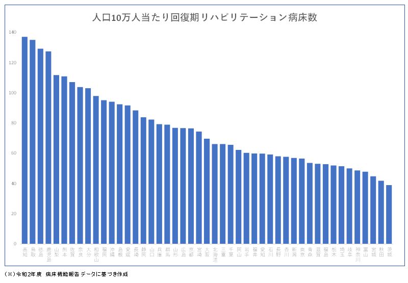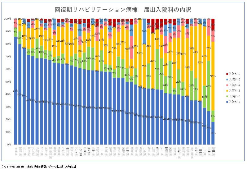 ただ、回復期的な機能の病床が不足することと、回復期リハビリテーション病棟の充足状況には、別の意味があるとも考えられる。グラフ1は、直近の2020年度病床機能報告データを用いて、都道府県別に人口10万人当たりの回復期リハビリテーション病床数を見たものであり、地域によってはすでに過剰と言える状況なのだろう。ただ、最も病床数が充実している高知県などが上位の入院料を届出している割合が多いかというと、必ずしもそうではなく、病床数だけで評価できるものではないようだ=グラフ2=。
