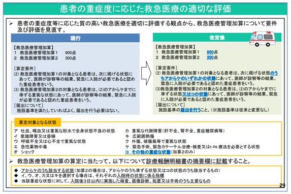 答申書附帯意見には、「救急医療管理加算の見直しの影響を調査・検証し、患者の重症度等に応じた救急医療の適切な評価の在り方について引き続き検討すること」と記載された。20年4月の改定以降の、救急医療管理加算の算定症例には、重症度の指標や入院後3日以内に実施した主要な医療資源投入内容などが、診療報酬明細書の摘要欄に記載されることとなり、今回の改定ではデータに基づく議論が展開されることが想定されていた。