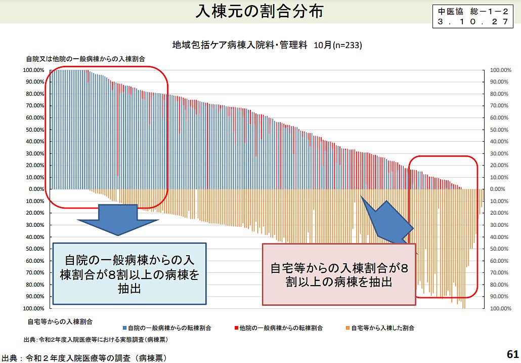 ただ、厚生労働省のデータによると、自宅等からの入棟患者と自院の一般病棟からの入棟患者の割合の分布を見ると、自院の一般病棟から多くの患者を受け入れる一方、自宅等からの受け入れが少ない病棟が一定数存在する。