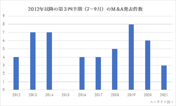 ストライクは、全上場企業に義務付けられた東証適時開示情報のうち、経営権の移転を伴うM&A(グループ内再編は除く)の発表件数を集計した。