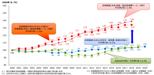 これに対して20年度の実際の改定率は、診療報酬本体がプラス0.55%、薬価・材料価格が1.01%のマイナスでした。それらを合わせた全体でのマイナス改定が実現しましたが、下げ幅は0.46%。2%台半ば以上には遠く及びませんでした。