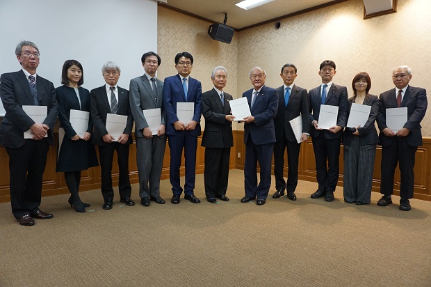 鈴木財務相(右から5番目)に建議を手渡す財政審の榊原会長