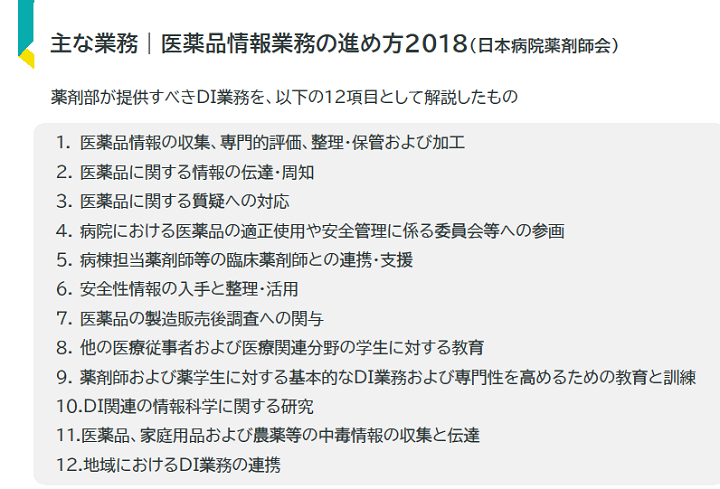 主なDI業務については、日本病院薬剤師会が策定した「医薬品情報業務の進め方2018」で、「医薬品情報の収集、専門的評価・整理・保管および加工」など12項目が挙げられている。セミナーでは、この項目を踏まえた形で、病院DI業務を担当する薬剤師が自院の取り組みなどを報告した。