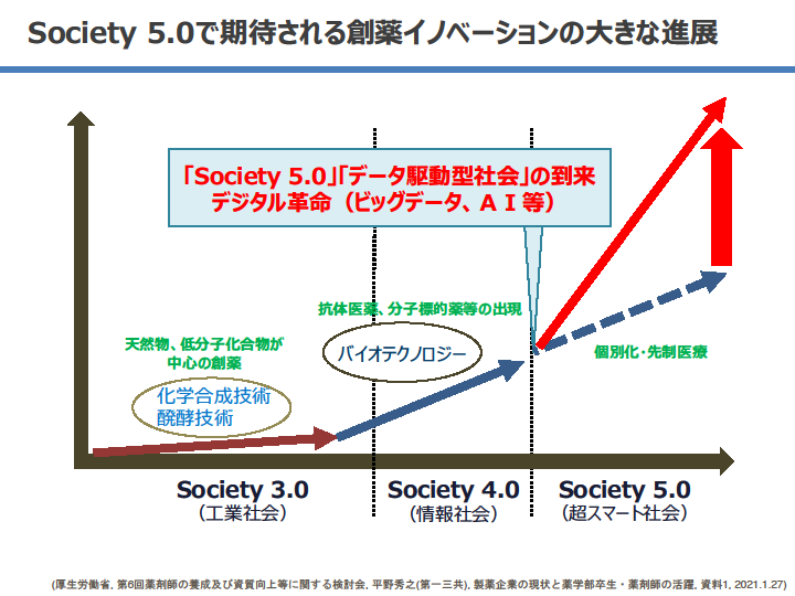 浜松医科大学医学部附属病院薬剤部長・教授の川上純一氏は、「病院薬剤師の果たす役割の変化と医薬品情報業務」をテーマに基調講演を行った。この中で川上氏は、データヘルス改革により、新しい投薬ターゲットやバイオマーカーの同定、治験、臨床研究の迅速化が進むと指摘。高速・大容量通信規格「5G」などを活用した超スマート社会、いわゆる「Society 5.0」で、個別化医療や先制医療がさらに進むとの見通しを示した。