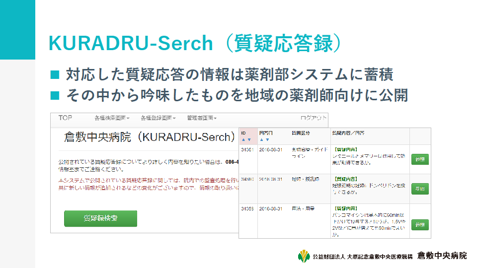 地域の薬剤師との連携も、DI業務の主な取り組みの1つだ。大原記念倉敷中央医療機構 倉敷中央病院薬剤部薬務・薬品情報室の西田麻以氏は、DI室で対応した質疑応答録の一部を地域の薬剤師向けに公開していると話した。質疑応答録は、同院薬剤部の薬剤師だけが閲覧できるクラウド型のデータベースに収録。その中から、地域の薬剤師に関係のありそうな内容かどうかなどを吟味し、情報を公開している。「問い合わせのあった薬剤師に、URLを送り、登録してもらう」(西田氏)。