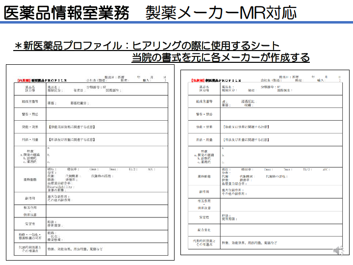 MRへの情報収集に関しても工夫している。同院の薬剤科では、基本情報の他に、開発の経緯や粉砕・一包化・簡易懸濁の可否、配合変化などをMRに記入してもらう独自のヒアリングシートを使って、情報を収集している。聴取項目のバラツキを防ぐとともに、他製品との比較もしやすくする狙いがある。聴取した内容は、薬剤採用時に薬剤科職員へ伝達され、病棟カンファレンスの場で病棟看護師に伝えられる、という流れだ。