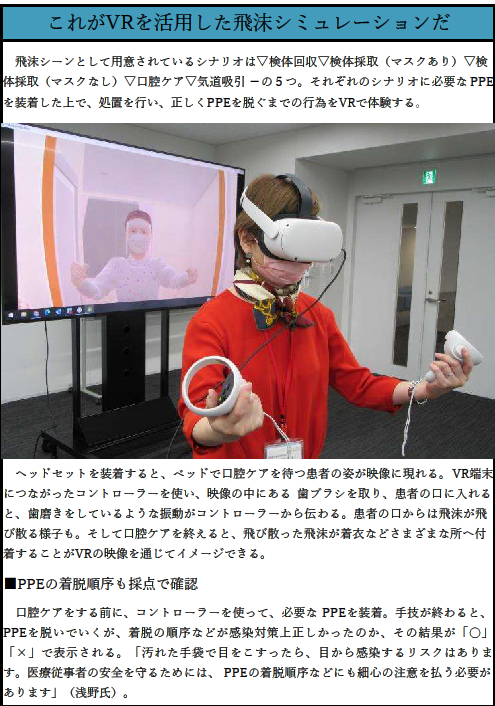菊地氏 VR空間で飛沫の飛散を可視化し、飛沫を疑似体験することで、感染予防の動機付けを高めるツールです。VRを使うことで、飛沫感染リスクの高い、「鼻咽頭の検体採取」と「口腔ケア」、「気道吸引」それぞれのケアによる感染リスクを視覚的に理解することができます。また、感染管理認定看護師が監修しており、ケアに応じて必要な個人防護具(PPE)の選択と着脱順序も、このシミュレーションを通じて学ぶことができます。