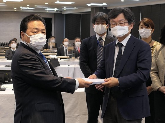 佐藤厚労副大臣に答申書を手渡す小塩会長(右)、厚労省提供