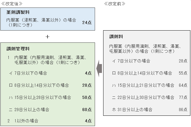 調剤関連では、薬局・薬剤師による対人業務の促進策の一環で調剤料を抜本的に見直すことになりました。中医協がまとめた個別改定項目によると、これまで調剤料でカバーしてきた業務への評価を「薬剤調製料」と「調剤管理料」に再編。薬剤の「調製」や「取りそろえ監査」などは、対物業務として新設の「薬剤調製料」で評価されます。内服薬の場合、調剤料は薬剤の投与日数に応じて5段階に設定されていますが、薬剤調製料は一律24点です。
